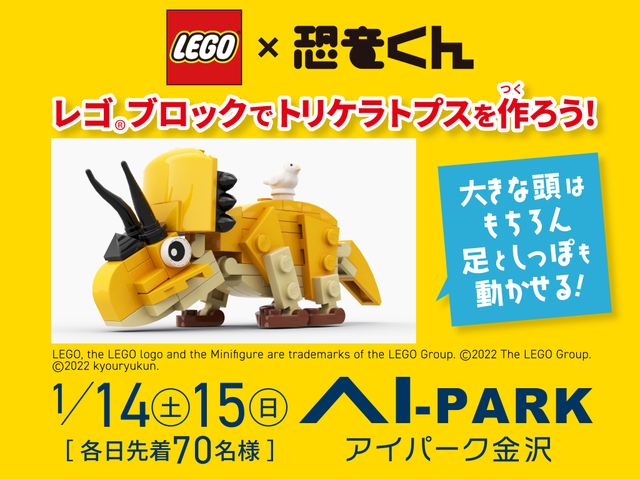 大きな頭や足としっぽも動かせる手のひらサイズの可愛らしいトリケラトプスをブロックで作ってみましょう!